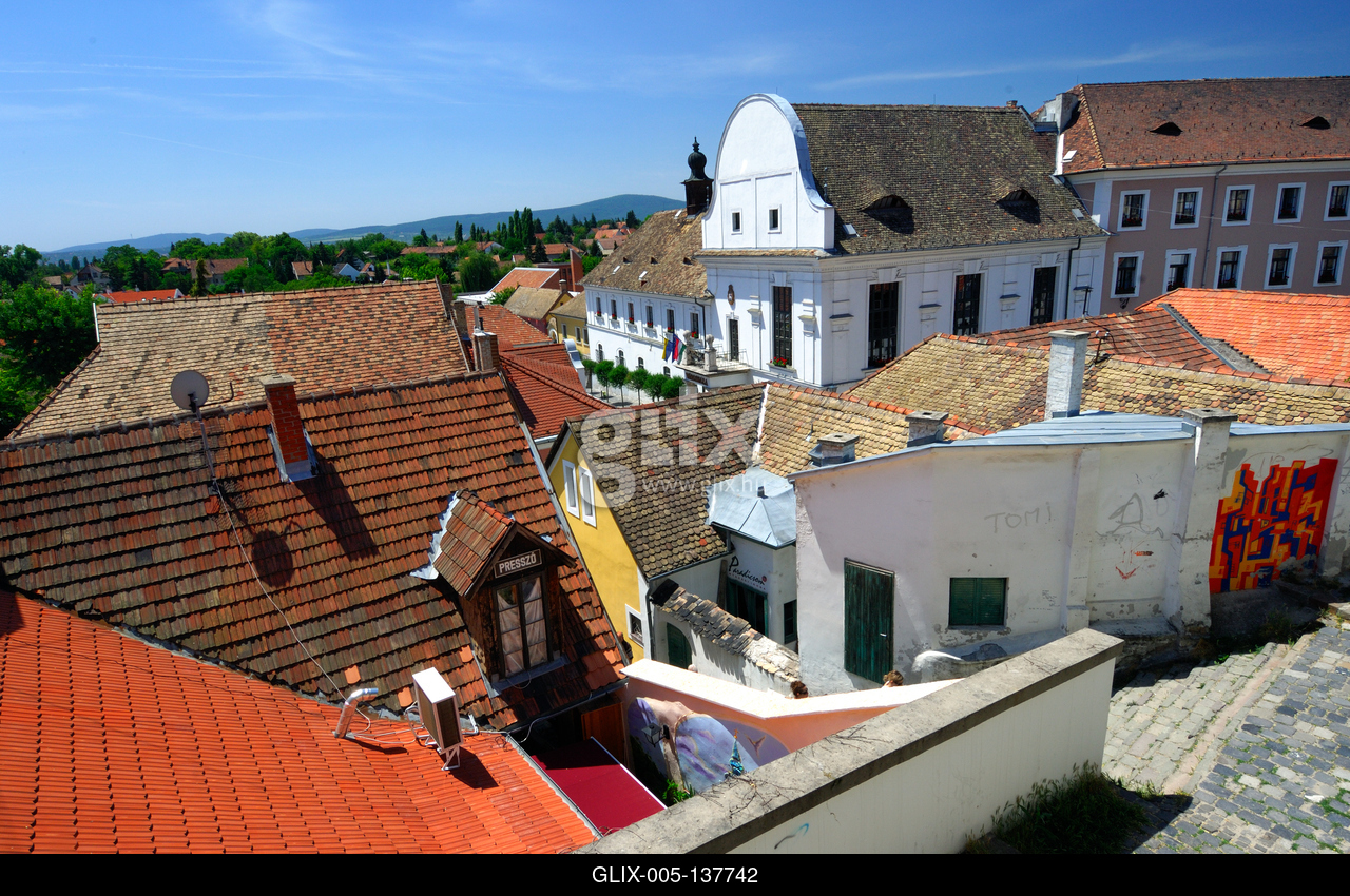 Szentendre, a belváros és a Városháza látványa a Várdomb aljából. A Városháza 1730 körül épült barokk stílusban. A XIX. században bővítették, mai alakját az 1924-es átalakítás idején kapta.