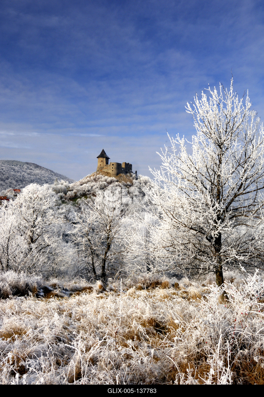 Téli tájkép Somoskő várával. A szlovák-magyar határon áll a Somoskői vár. A középkori várból csodás kilátás nyílik a környék településeire. A várhegytől rövid séta után eljuthatunk a somoskői bazaltorgonákhoz, melyek a területen lejátszódó, egykori vulkanizmus gyönyörű bizonyítékai.