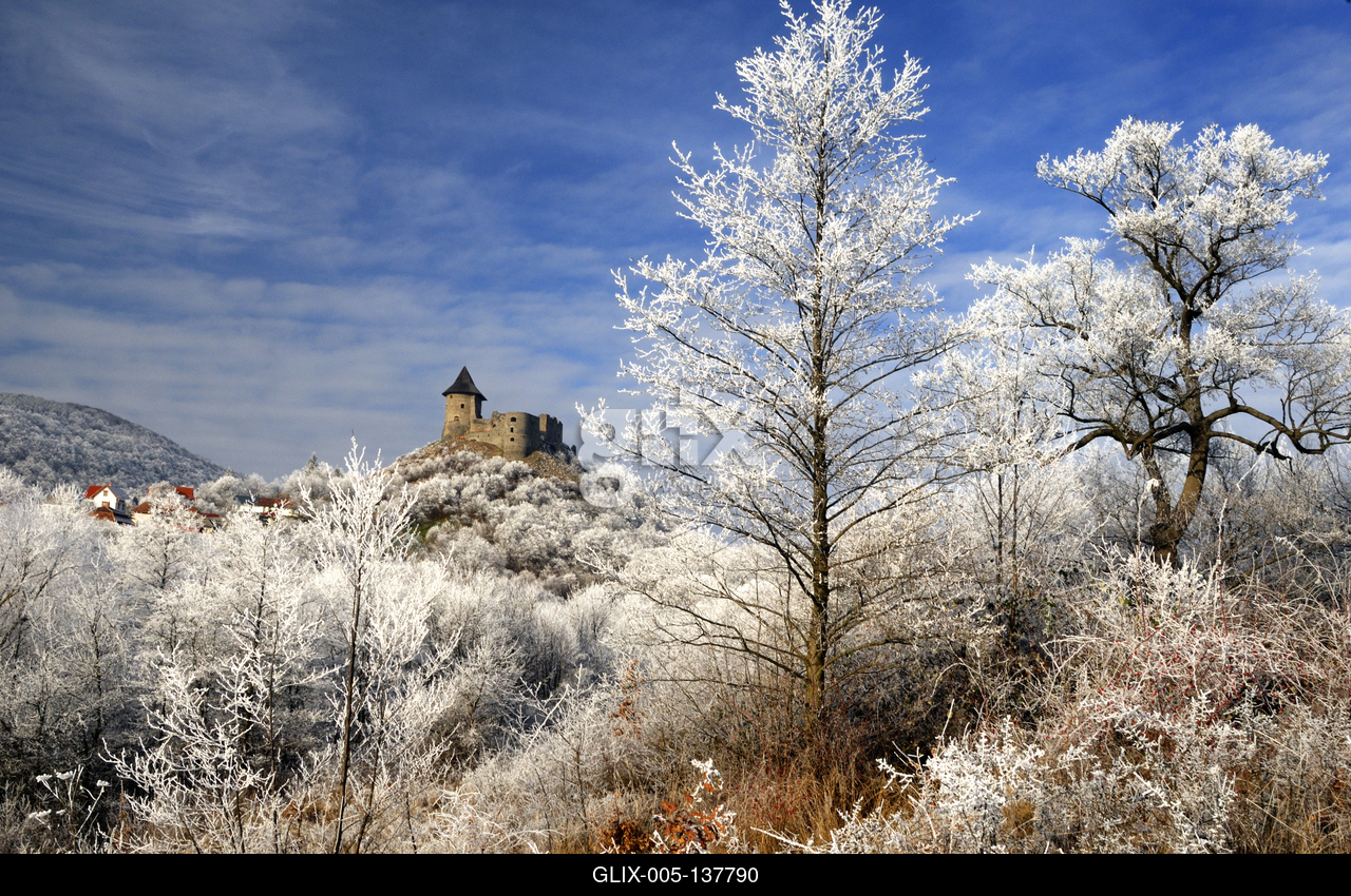 Téli tájkép Somoskő várával. A szlovák-magyar határon áll a Somoskői vár. A középkori várból csodás kilátás nyílik a környék településeire. A várhegytől rövid séta után eljuthatunk a somoskői bazaltorgonákhoz, melyek a területen lejátszódó, egykori vulkanizmus gyönyörű bizonyítékai.