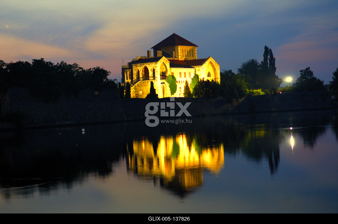 A Tatai vár az Öreg-tó partján éjszakai kivilágításban. Luxemburgi Zsigmond király építtette 1397–1409 között, talán a Lackfi család korábbi erődítményének helyén. A Zsigmond által emelt négyzetes alaprajzú, négy saroktornyos, belső udvaros várnak csak délkeleti szárnya áll, hozzá csatlakoznak a többi rész feltárt alapfalai.