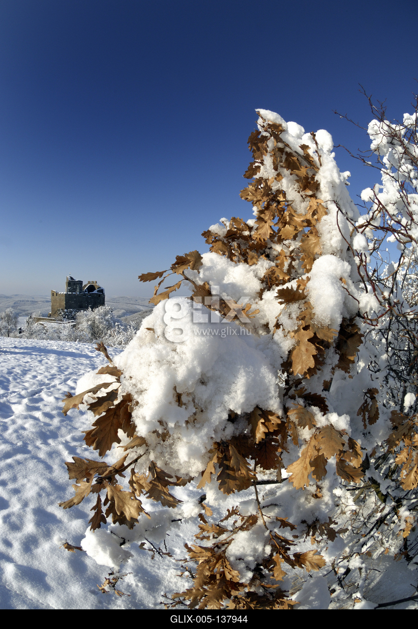 A Hollókői vár télen. Hollókő dísze a fölé magasodó, impozáns 13. századi vár, melynek legendájából származik a falu neve is. A vár számos alkalommal cserélt gazdát, 131 éven át ült a török a várban, majd 1711-ben I. Lipót, a szatmári békekötés után leromboltatta. 1966-tól a romvárat 30 év alatt részlegesen felújították, 1996 óta újra látogatható. A legutolsó felújítás 2015-ben történt.