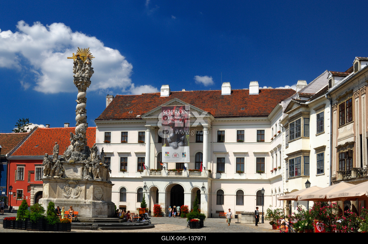 Sopron belvárosa (Fő tér) a Szentháromság-szoborral és a volt Megyeházával.