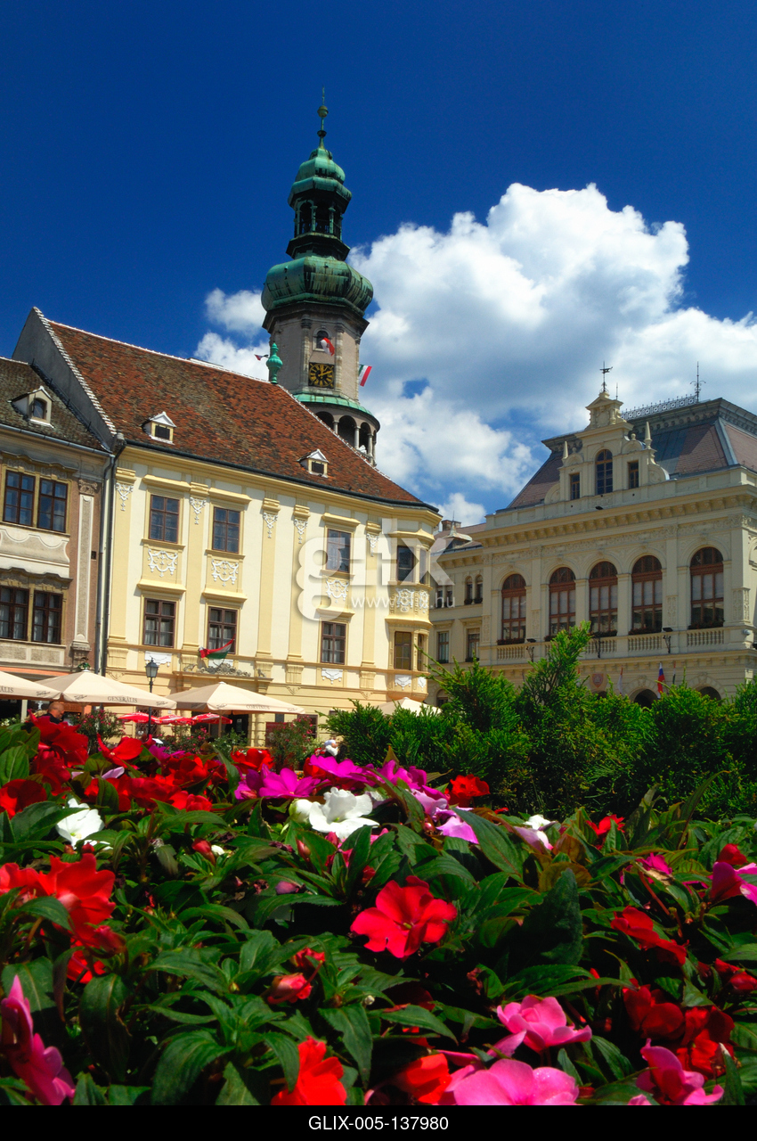Sopron belvárosa (Fő tér), Storno-ház, Tűztorony és a Városháza.
