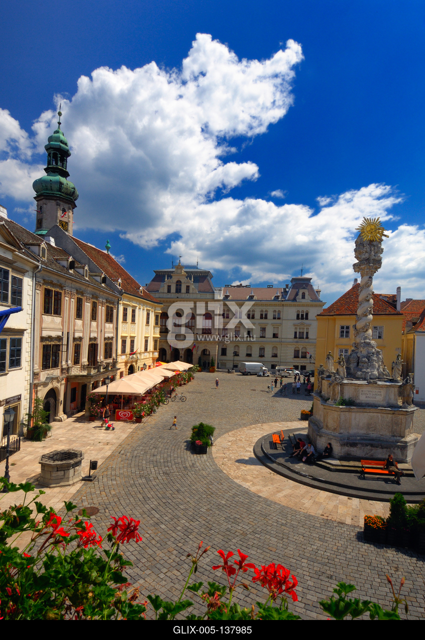 Sopron belvárosa (Fő tér), Tűztorony, Városháza és a Szentháromság-szobor.