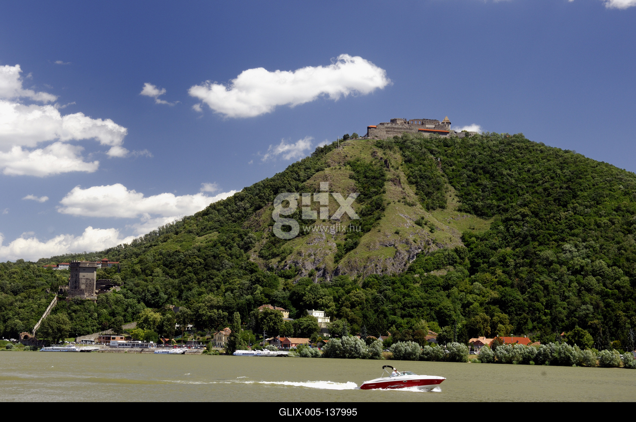 A Duna és a Visegrádi vár (Fellegvár) látványa Nagymarosról. A Dunakanyar talán legemblematikusabb látképe a Visegrád fölött magasodó meredek hegyen fekvő Fellegvár.