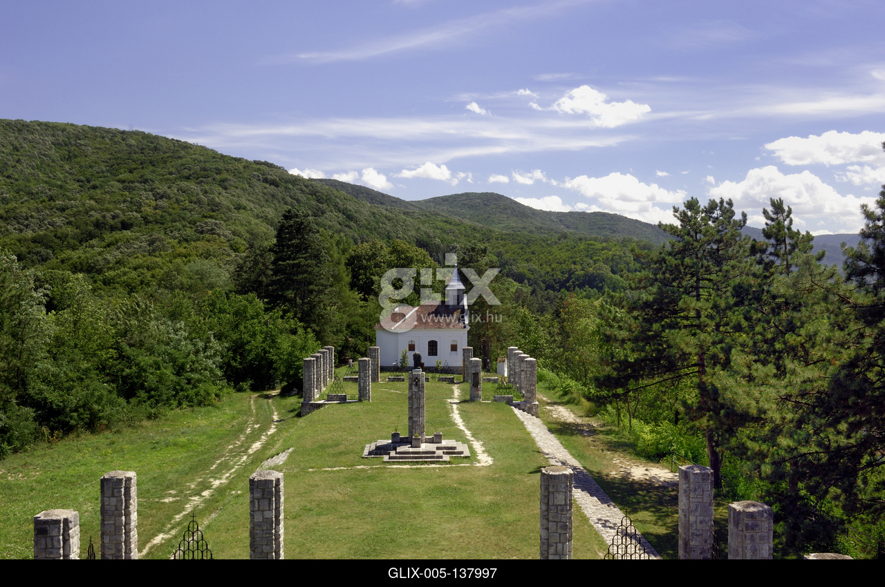 Zebegényi országzászló és hősi emlékmű. Az 1930-as években Maróti Géza tervei alapján épült emlékműegyüttes a börzsönyi falu fölé magasodó Kálváriahegyen, ahonnan festői panoráma nyílik a Dunakanyarra. Háttérben a Kálvária-kápolna látható.
