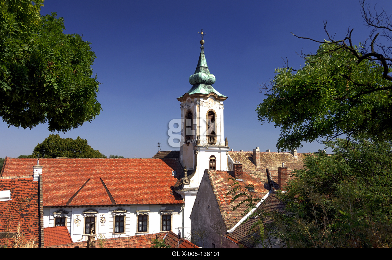 Szentendre, a Gyümölcsoltó Boldogasszony (Blagovesztenszka) templom látványa a Várdombról. Feltételezések szerint az épületet Mayerhoffer András (1690-1771) tervezte. A templomot 1754. október 15-én Dioniszilje Novákovics budai püspök szentelte fel. A templom védőszentje Gyümölcsoltó Boldogasszony. A Fő tér keleti oldalán emelkedő, kelet-nyugat tengelyű templom barokk és rokokó stílusban épült.