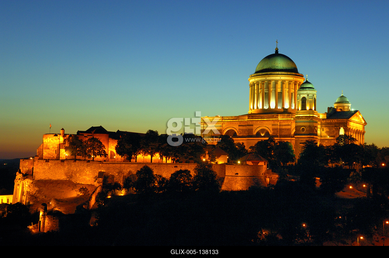 Az Esztergomi bazilika látványa esti kivilágításban. Az esztergomi Nagyboldogasszony- és Szent Adalbert-főszékesegyház az Esztergom-Budapesti főegyházmegye székesegyháza. A klasszicista stílusban épült templom 1822 és 1869 között épült és a Szent István téren áll. Külső méreteit tekintve Magyarország legnagyobb egyházi épülete, az altemplomtól a kupola gömbjéig 100 méter magas