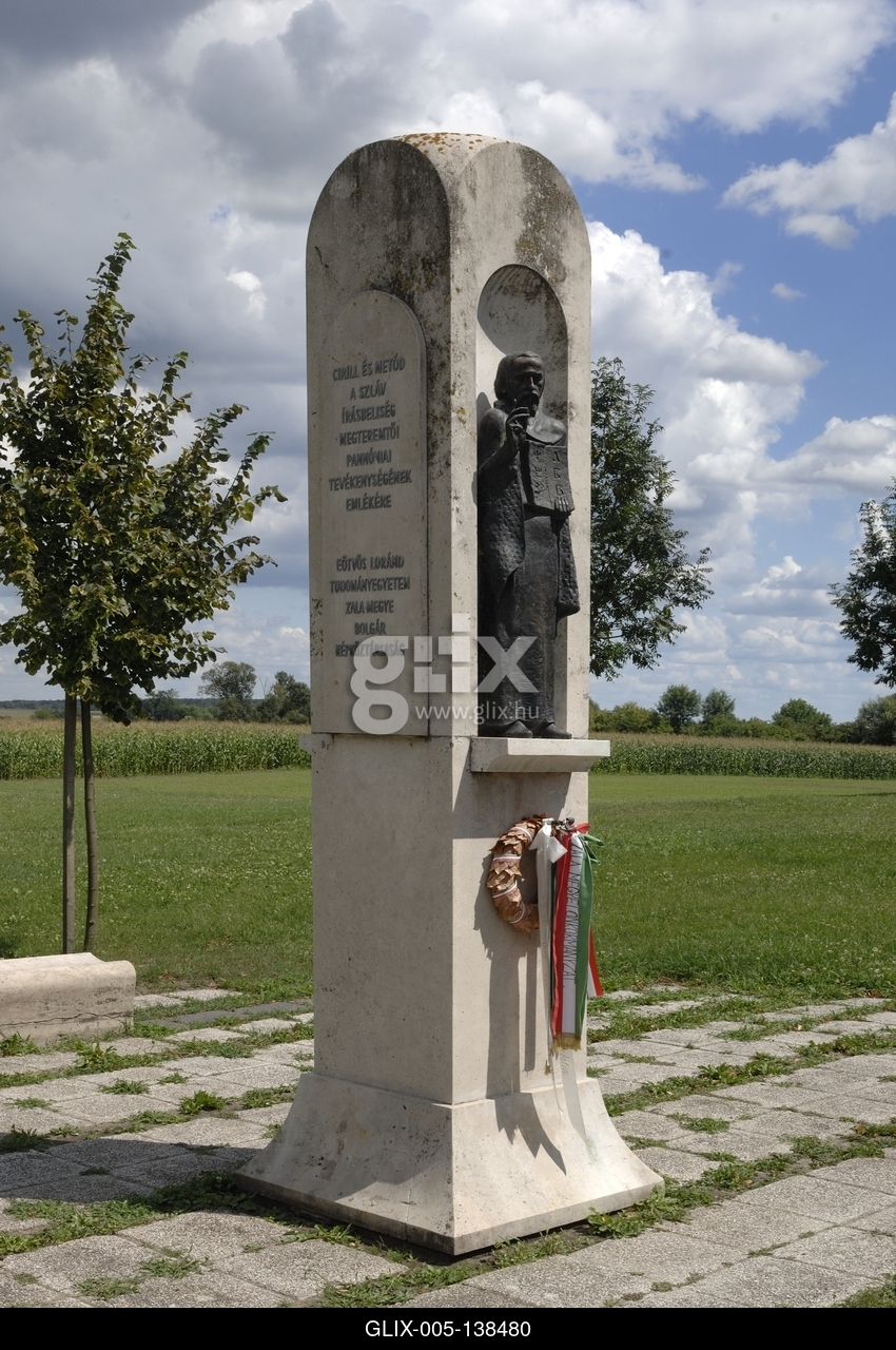 Zalavár, Cirill és Metód-emlékmű a Történelmi Emlékparkban. Bolgár kezdeményezésre állítottak 1985-ben. Az oszlop két oldalán található a két keresztény hittérítő szent bronzszobra, melyek Janzer Frigyes alkotásai.