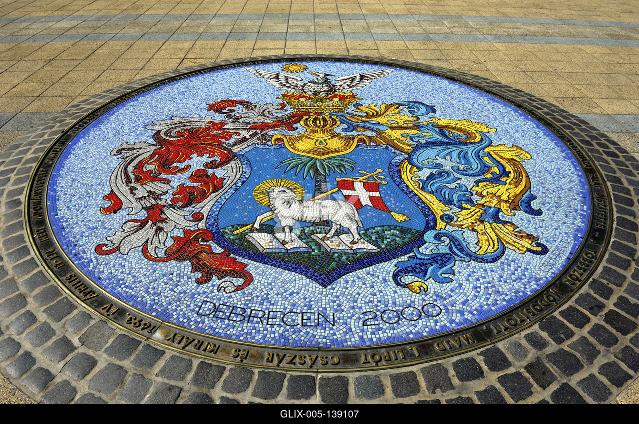 Debrecen címere a Kossuth téren. Fél évig készült, és csaknem 180 ezer mozaikelem alkotja a cívisváros jelképét ábrázoló, művészi mozaikot, ami a Kossuth teret ékesíti.