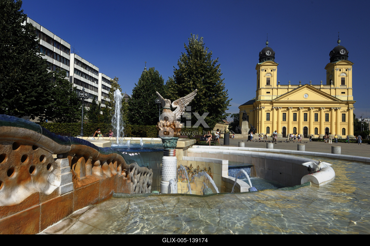 Debrecen, a Millenniumi szökőkút és a Református Nagytemplom a Kossuth téren. Az ország egyik legnagyobb zenélő szökőkútját 2001-ben, a város felújított főterével együtt adták át. Dísze a magyarok bejövetelét ábrázoló Honfoglalás című kép, valamint a főnixmadár, amely a város újjászületésének jelképe.