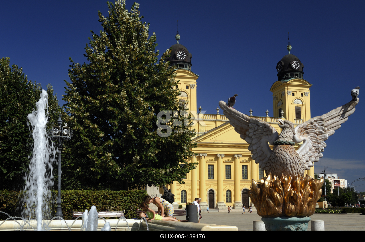 Debrecen, a Millenniumi szökőkút és a Református Nagytemplom a Kossuth téren. Az ország egyik legnagyobb zenélő szökőkútját 2001-ben, a város felújított főterével együtt adták át. Dísze a magyarok bejövetelét ábrázoló Honfoglalás című kép, valamint a főnixmadár, amely a város újjászületésének jelképe.