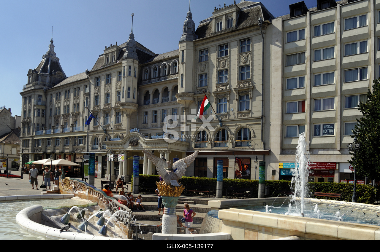 Debrecen, Grand Hotel Aranybika, előtérben a a Millenniumi szökőkút. A Bajcsy-Zsilinszky és a Piac utca sarkán, a Kossuth tér mellett áll a Grand Hotel Aranybika, Magyarország egyik legpatinásabb szállodája. Az 1536 óta Debrecenben élő Bika család telkét és kőházát 1690-ben vásárolta meg a város. 1699-ben az épületet fogadónak alakították ki, 1799-ben pedig emeletet húztak fel rá. 1810-ben került a vasból vert, rézzel bevont, öklelő bikát ábrázoló cégér a homlokzatra. Így lett Bika János egykori fogadójából Aranybika Szálló.