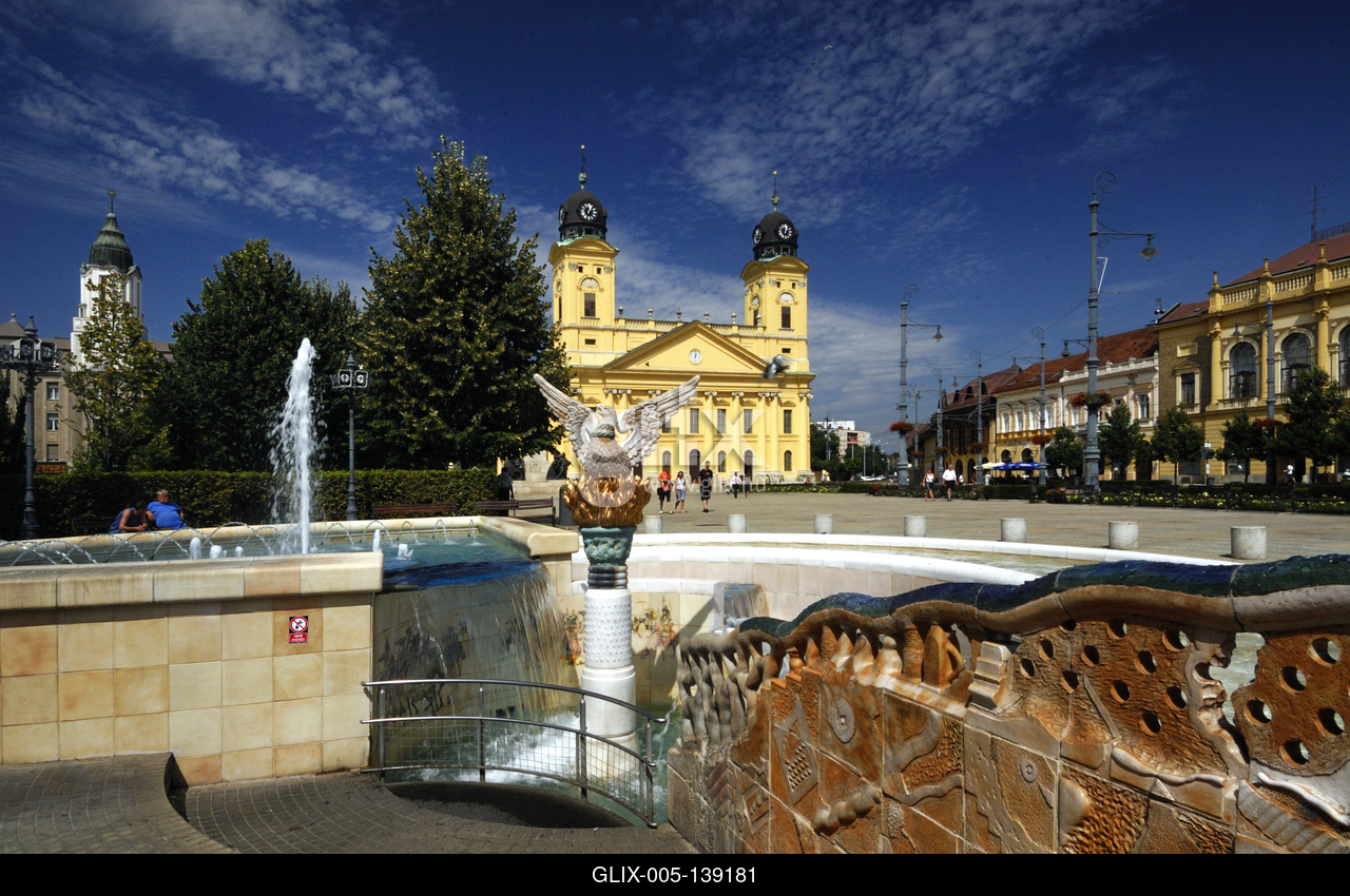 Debrecen, a Millenniumi szökőkút és a Református Nagytemplom