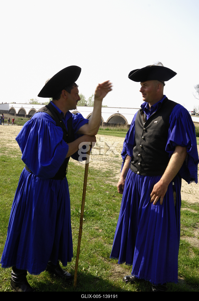 Hortobágyi csikósok. A csikósok a 19. század vége a 20. század eleje óta viselik a kék színű, bő ujjú inget, a ráncos, alul rojtozott kék gatyát. Azelőtt, mint a gulyások, ők is fehérben jártak. Kemény szárú oldal varrott csizma, állszíjjal rögzíthető, nagy karimájú kalap tartozott még tipikus öltözetükhöz. Megkülönböztető jelzés volt a kék színű öltönyön kívül az is, hogy az igazi csikósnak a kalapja mellé darutollat illett tűzni.