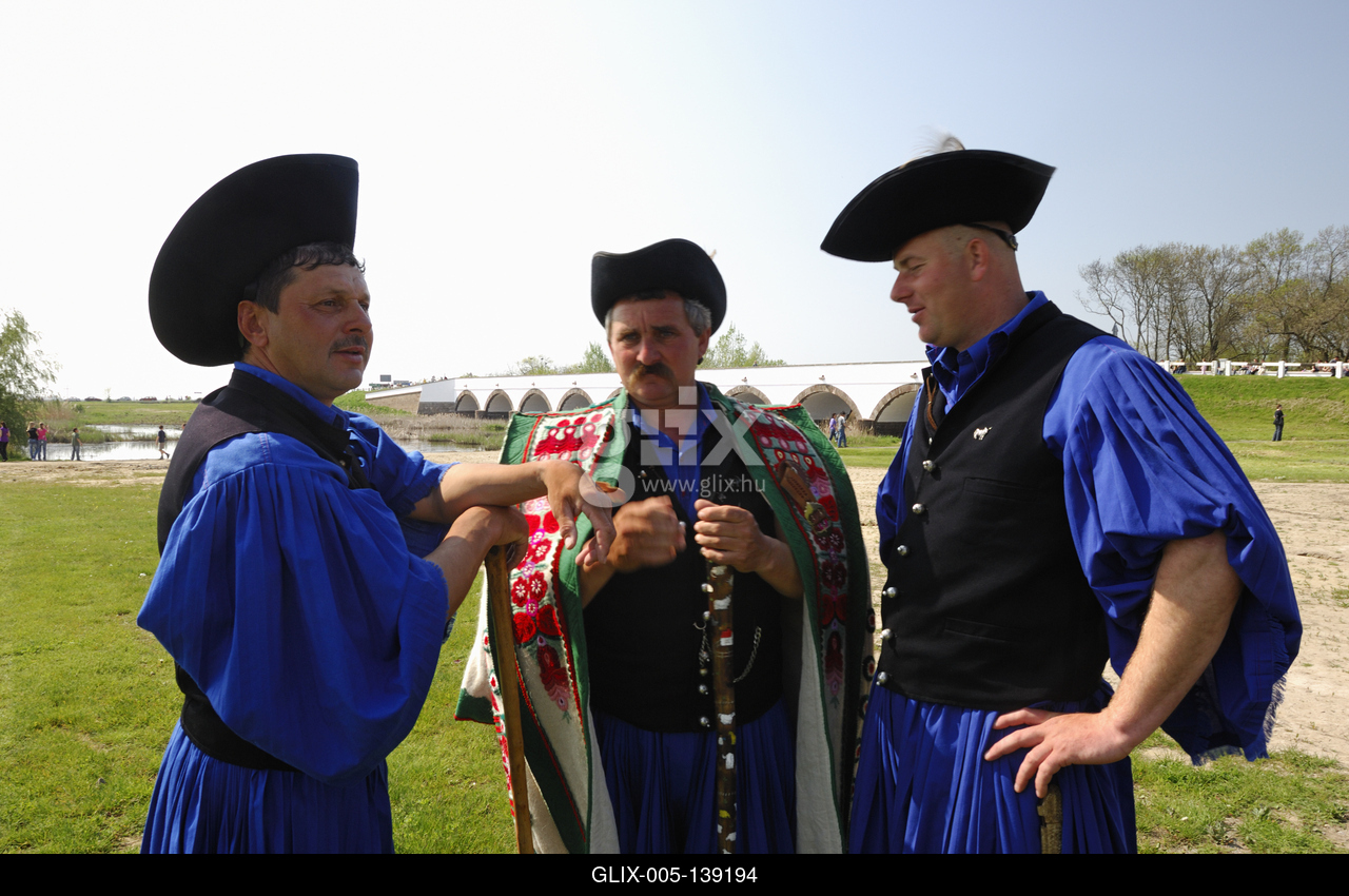 Hortobágyi csikósok. A csikósok a 19. század vége a 20. század eleje óta viselik a kék színű, bő ujjú inget, a ráncos, alul rojtozott kék gatyát. Azelőtt, mint a gulyások, ők is fehérben jártak. Kemény szárú oldal varrott csizma, állszíjjal rögzíthető, nagy karimájú kalap tartozott még tipikus öltözetükhöz. Megkülönböztető jelzés volt a kék színű öltönyön kívül az is, hogy az igazi csikósnak a kalapja mellé darutollat illett tűzni.