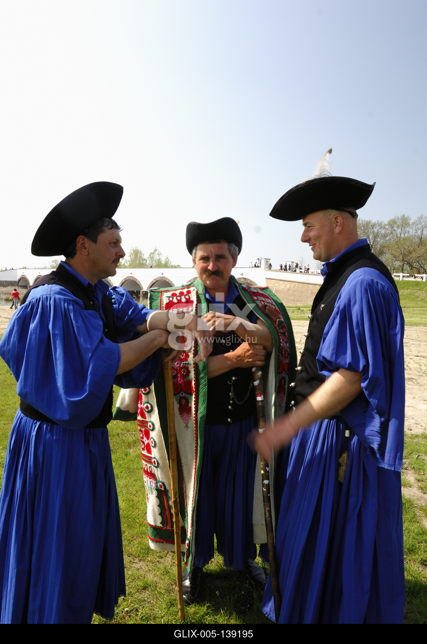 Hortobágyi csikósok. A csikósok a 19. század vége a 20. század eleje óta viselik a kék színű, bő ujjú inget, a ráncos, alul rojtozott kék gatyát. Azelőtt, mint a gulyások, ők is fehérben jártak. Kemény szárú oldal varrott csizma, állszíjjal rögzíthető, nagy karimájú kalap tartozott még tipikus öltözetükhöz. Megkülönböztető jelzés volt a kék színű öltönyön kívül az is, hogy az igazi csikósnak a kalapja mellé darutollat illett tűzni.