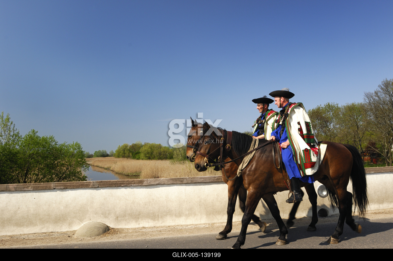 Hortobágyi csikósok. A csikósok a 19. század vége a 20. század eleje óta viselik a kék színű, bő ujjú inget, a ráncos, alul rojtozott kék gatyát. Azelőtt, mint a gulyások, ők is fehérben jártak. Kemény szárú oldal varrott csizma, állszíjjal rögzíthető, nagy karimájú kalap tartozott még tipikus öltözetükhöz. Megkülönböztető jelzés volt a kék színű öltönyön kívül az is, hogy az igazi csikósnak a kalapja mellé darutollat illett tűzni.