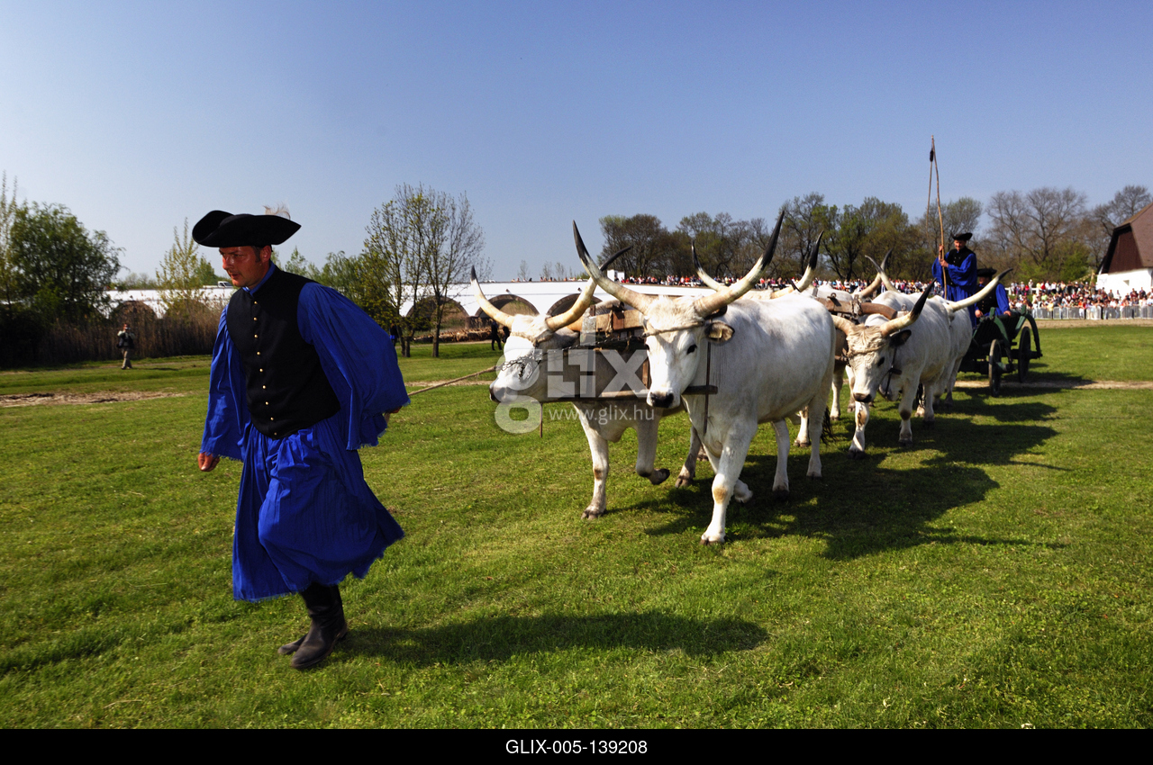 Hortobágy, hat ökrös szekér a Kilenclyukú hídnál. Hortobágy évszázados hasznosítási módja az extenzív állattartás volt. Közép- és Nyugat-Európa egyetlen nagy kiterjedésű füves pusztáján a természettel együtt élő ember sajátos állattartási rendet alakított ki, melyhez egyedi módszerek, hagyományok társultak.