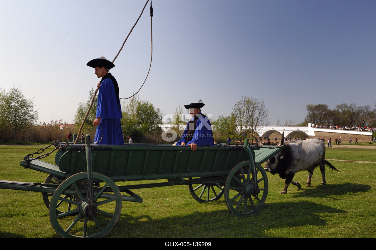 Hortobágy, hat ökrös szekér a Kilenclyukú hídnál. Hortobágy évszázados hasznosítási módja az extenzív állattartás volt. Közép- és Nyugat-Európa egyetlen nagy kiterjedésű füves pusztáján a természettel együtt élő ember sajátos állattartási rendet alakított ki, melyhez egyedi módszerek, hagyományok társultak.