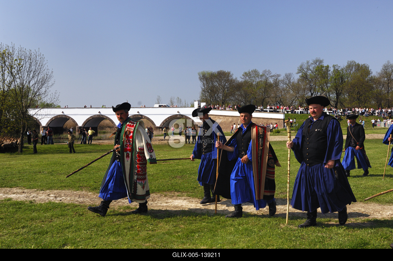 Hortobágyi pásztorok a Kilenclyukú hídnál. A Hortobágy pásztorai sajátos életmódjukkal különös romantikát kölcsönöznek a pusztának, amely egyrészt a hagyományok ápolása, másrészt pedig vonzó, turistacsalogató látványosság.