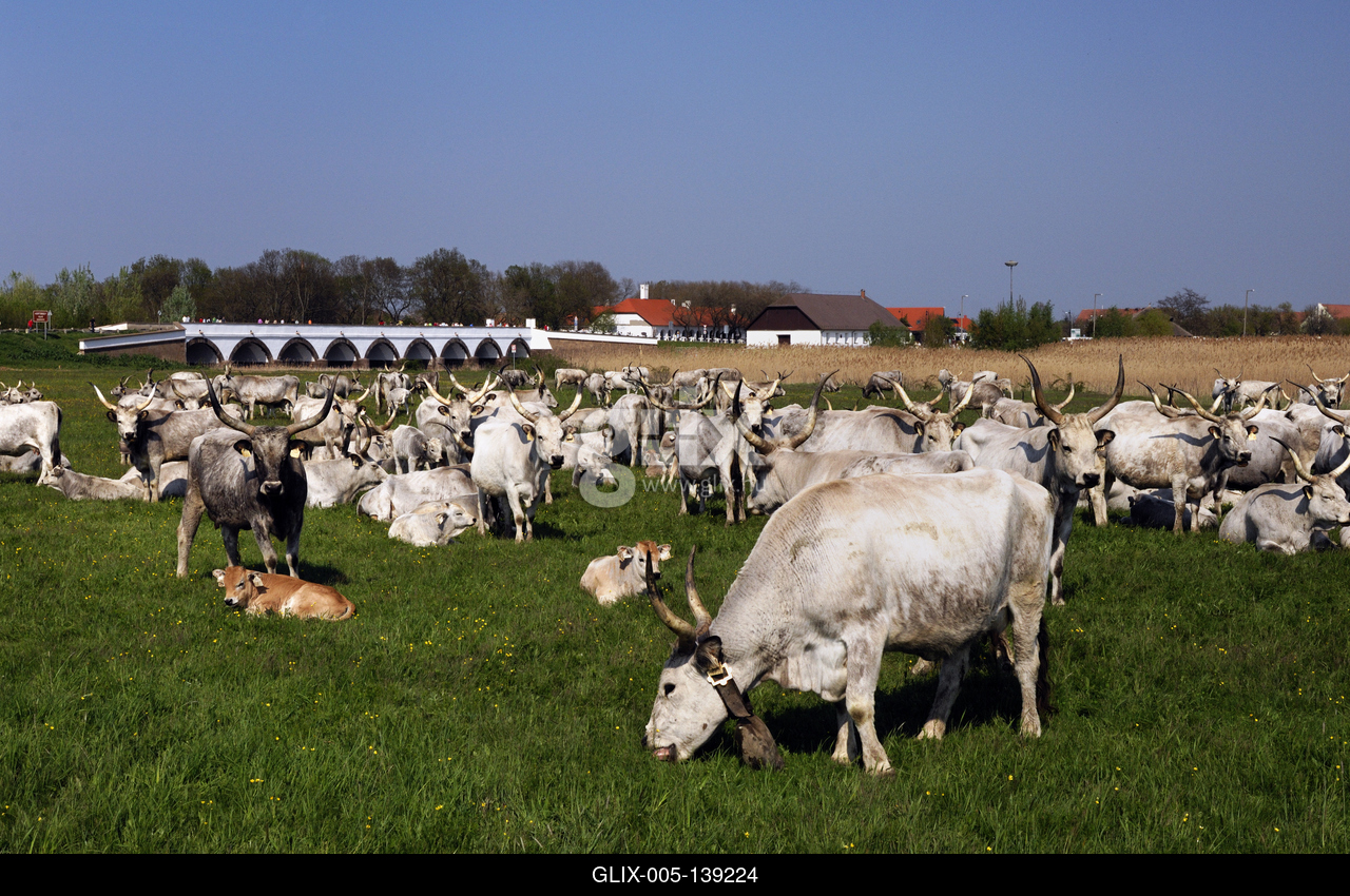 Hortobágy, magyar szürkemarha gulya a Kilenclyukú hídnál