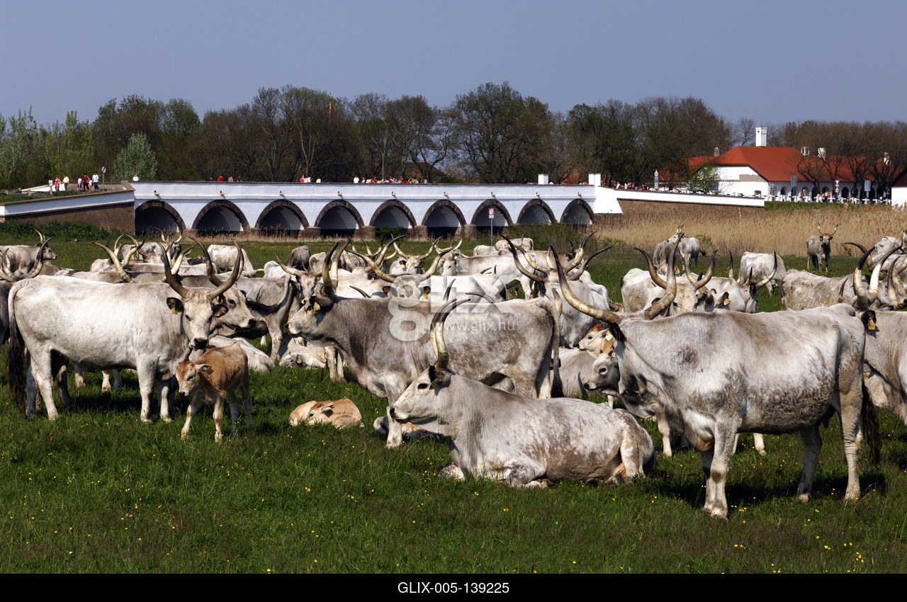 Hortobágy, magyar szürkemarha gulya a Kilenclyukú hídnál