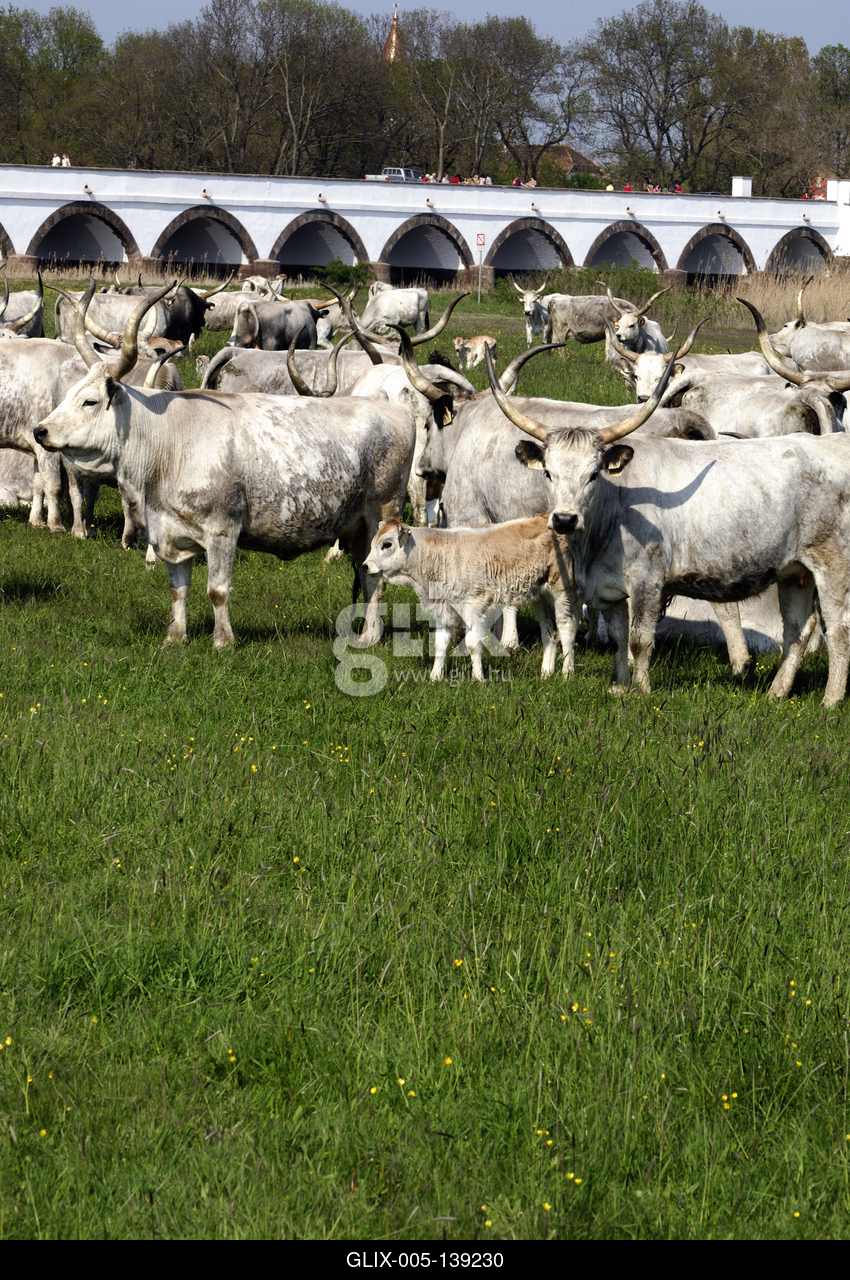 Hortobágy, magyar szürkemarha gulya a Kilenclyukú hídnál