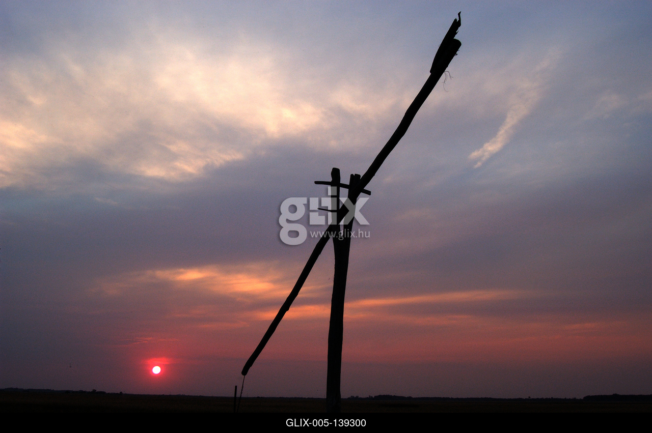 Hortobágy, gémeskút a nyári naplementében. A Hortobágy Magyarország egyik kistája, a Közép-Tisza-vidék része. Területe 1700 km². A gyéren lakott vidék nagy része nemzeti park. A hortobágyi puszta és a hozzá társított alföldi pásztor- és betyár romantika az ország egyik idegenforgalmi vonzereje.