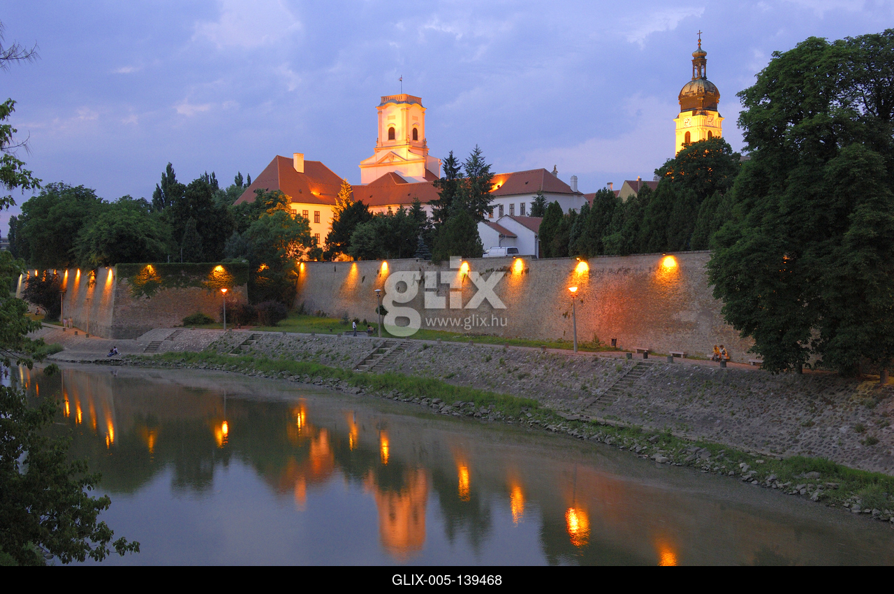 Győr, a Püspökvár látképe a Rába folyó partján, esti fényben. A Püspökvár épületegyüttese Győr történelmi belvárosában található. A bazilika mellett Győr legjelentősebb és legrégibb műemléke, a mindenkori győri püspök lakóhelye. A négyemeletes lakótorony a Püspökvár magját alkotja, felső részét barokk stílusban építették. Délről gótikus kápolnát építettek hozzá.