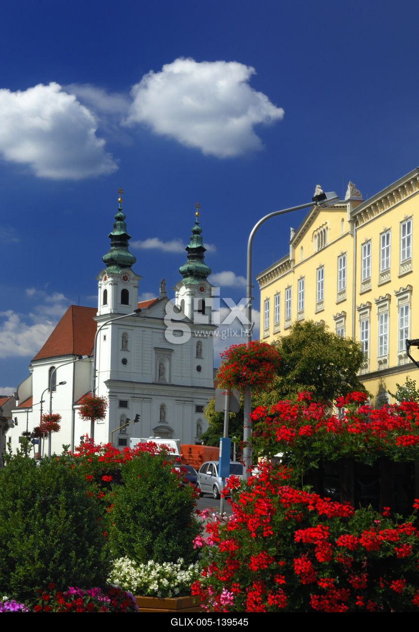Sopron, a Domonkos templom a Széchenyi téren. A templom 1719-1925 között épült Eisenkölbl Lőrinc vezetésével. A tornyok 1775-re készültek el. A homlokzat falfülkéiben szentek szobrai, az oromzat timpanonán Krisztus alakja látható.