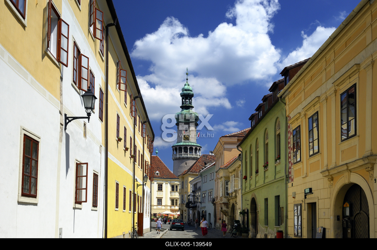 Sopron belvárosa a Tűztoronnyal. Az 58 méter magas soproni tűztorony a város jelképe. A Fő téren áll. A 13. században építették, majd évszázadokon át szolgálta a várost. Állékonyságát a 19. század végén, a Városháza építése során, elveszítette, majd statikai okokból kapuját leszűkítették. Eredeti jellegét a 2009-2012-es megerősítése és helyreállítása során kapta vissza.