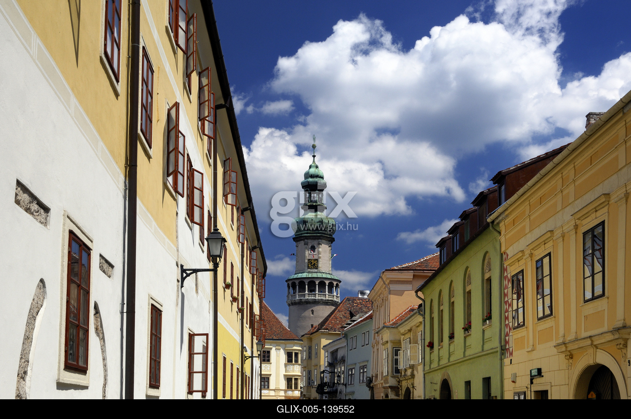 Sopron belvárosa a Tűztoronnyal. Az 58 méter magas soproni tűztorony a város jelképe. A Fő téren áll. A 13. században építették, majd évszázadokon át szolgálta a várost. Állékonyságát a 19. század végén, a Városháza építése során, elveszítette, majd statikai okokból kapuját leszűkítették. Eredeti jellegét a 2009-2012-es megerősítése és helyreállítása során kapta vissza.