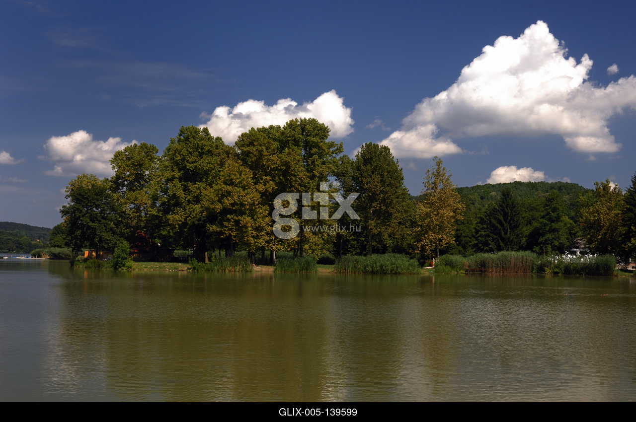 Az Orfűi-tó látképe. A tó Orfű és Mecsekrákos között fekszik. A gátakkal övezett partú tó mára már híres kirándulóközpont, a fürdőzők és horgászok paradicsoma lett.
