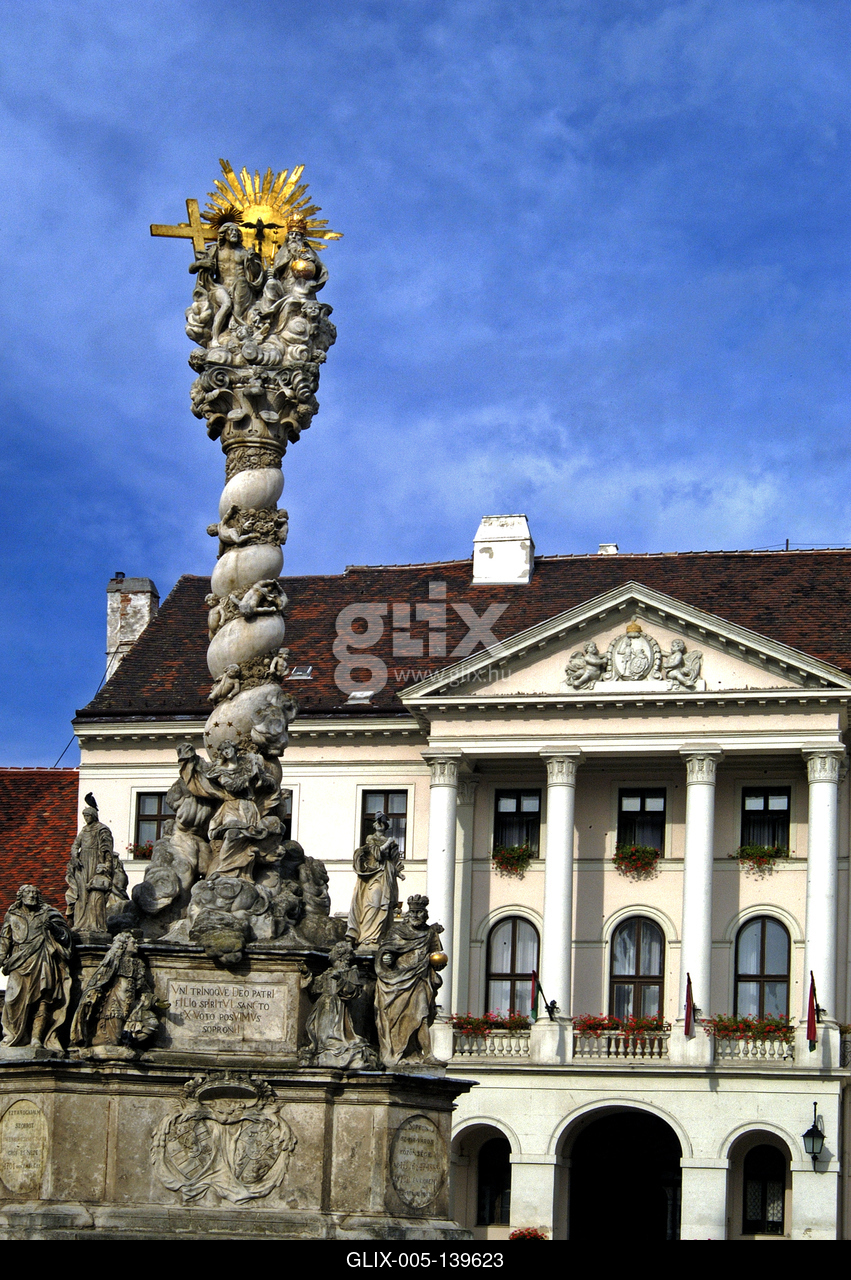 Sopron belvárosa (Fő tér) a Szentháromság-szoborral és a volt Megyeházával. A Fő tér alaprajza és épületeinek elhelyezkedése a XIII. század óta változatlan. A tér közepén áll a tér egyik legismertebb látványossága a Löwenburg Jakab adományából készült Szentháromság-szobor Szentháromság-szobor.