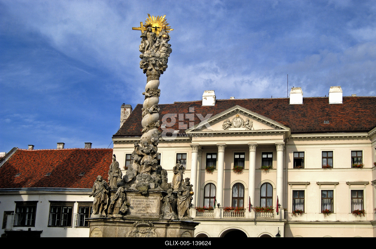 Sopron belvárosa (Fő tér) a Szentháromság-szoborral és a volt Megyeházával. A Fő tér alaprajza és épületeinek elhelyezkedése a XIII. század óta változatlan. A tér közepén áll a tér egyik legismertebb látványossága a Löwenburg Jakab adományából készült Szentháromság-szobor Szentháromság-szobor.