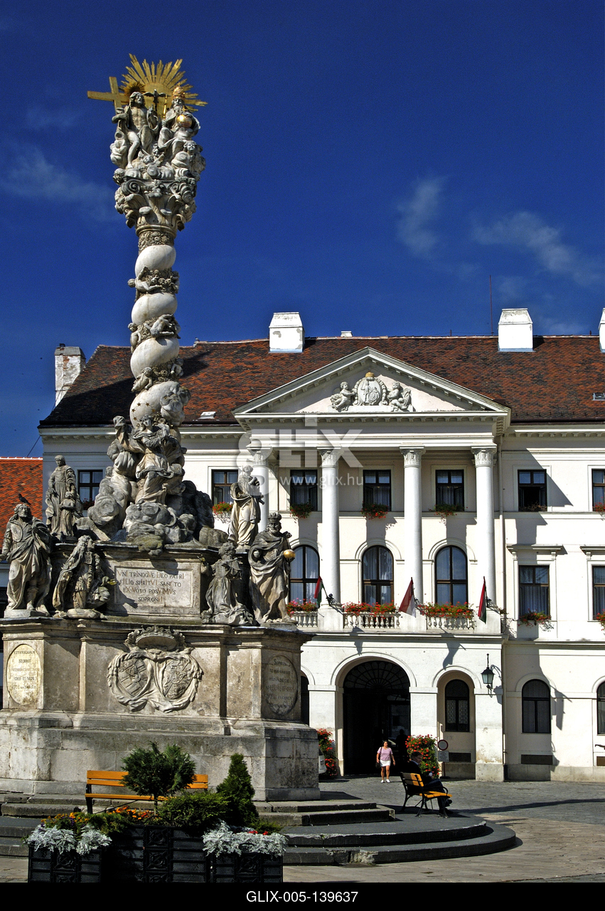 Sopron belvárosa (Fő tér) a Szentháromság-szoborral és a volt Megyeházával. A Fő tér alaprajza és épületeinek elhelyezkedése a XIII. század óta változatlan. A tér közepén áll a tér egyik legismertebb látványossága a Löwenburg Jakab adományából készült Szentháromság-szobor Szentháromság-szobor.