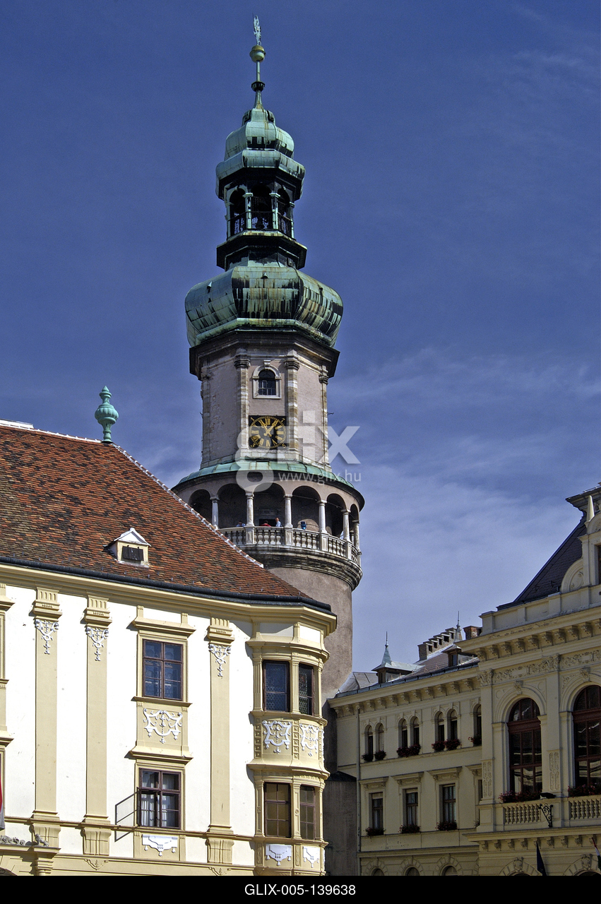 Sopron belvárosa (Fő tér) a Tűztoronnyal. Az 58 méter magas soproni tűztorony a város jelképe. A Fő téren áll. A 13. században építették, majd évszázadokon át szolgálta a várost. Állékonyságát a 19. század végén, a Városháza építése során, elveszítette, majd statikai okokból kapuját leszűkítették. Eredeti jellegét a 2009-2012-es megerősítése és helyreállítása során kapta vissza.