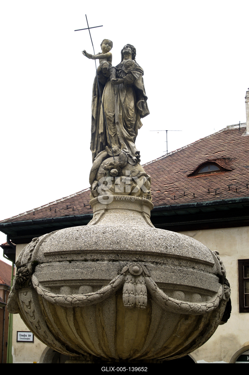 Sopron, Mária-kút az Orsolya téren. A tér közepén álló Mária-kút a XVIII: század második felében készült. A város bombázásakor súlyosan megsérült. A megmaradt anyag felhasználásával faragták újra a félgömböt és a kőfedelén álló Máriát, karján a gyermek Jézussal.