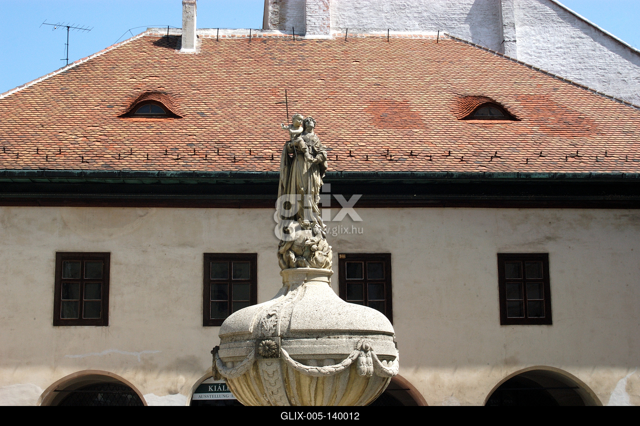 Sopron, Mária-kút az Orsolya téren. A tér közepén álló Mária-kút a XVIII: század második felében készült. A város bombázásakor súlyosan megsérült. A megmaradt anyag felhasználásával faragták újra a félgömböt és a kőfedelén álló Máriát, karján a gyermek Jézussal.