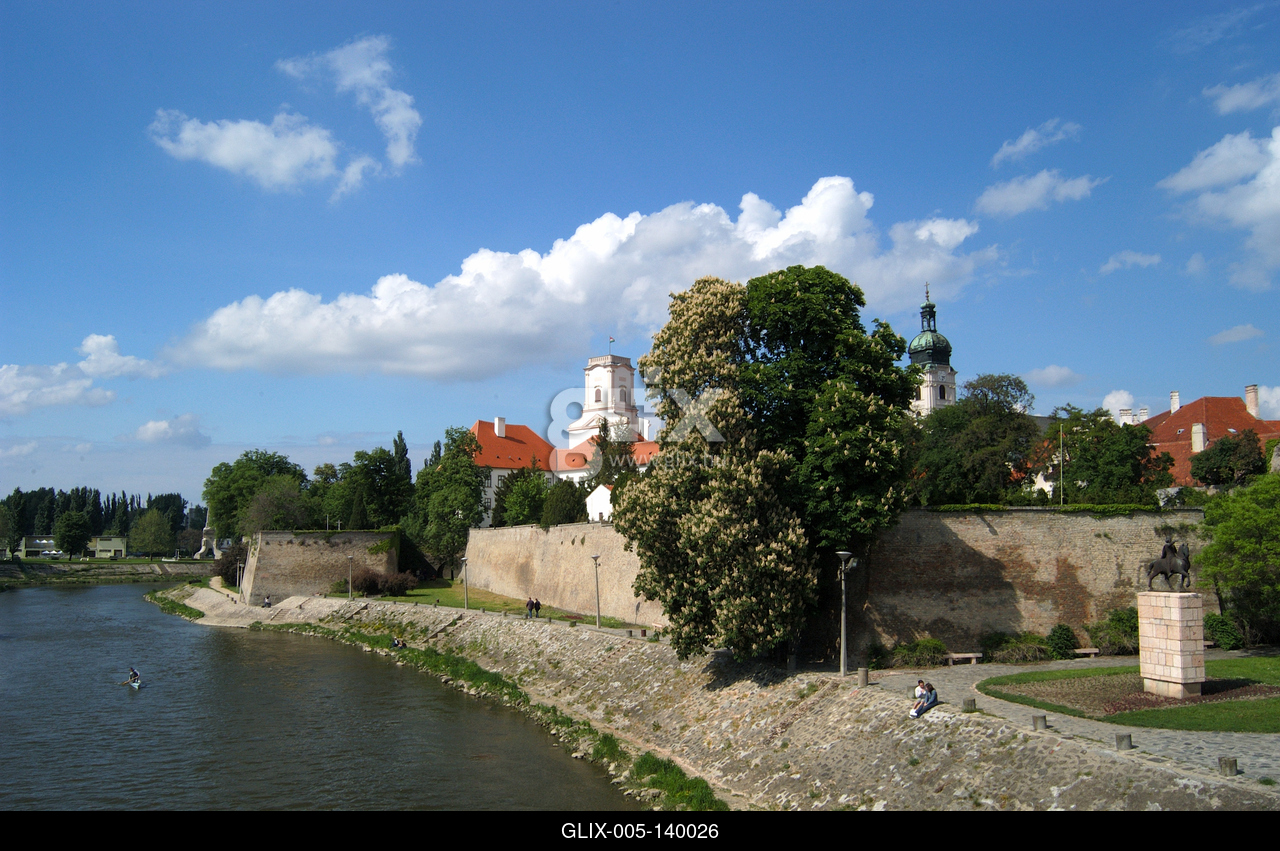 Győr, a Püspökvár látképe a Rába folyó partján. A Püspökvár épületegyüttese Győr történelmi belvárosában található. A bazilika mellett Győr legjelentősebb és legrégibb műemléke, a mindenkori győri püspök lakóhelye. A négyemeletes lakótorony a Püspökvár magját alkotja, felső részét barokk stílusban építették. Délről gótikus kápolnát építettek hozzá.