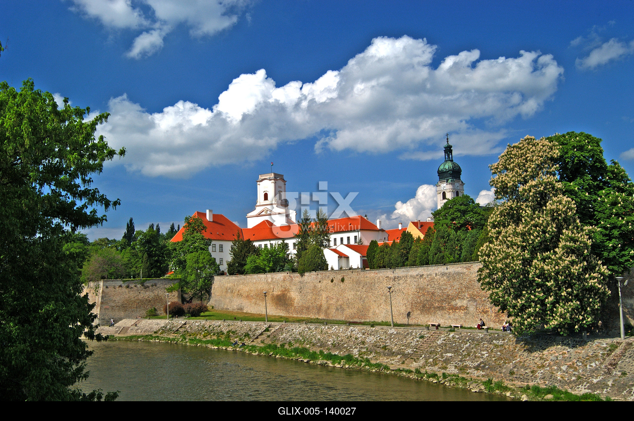 Győr, a Püspökvár látképe a Rába folyó partján