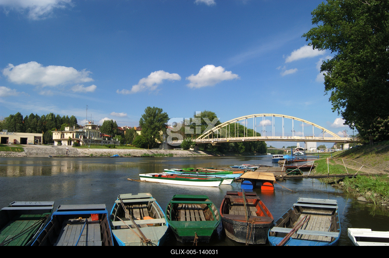 Győr, csónakok a Rába folyón. A Rába kanyargó, heves áradású folyó volt. Számos malom és hajómalom működött rajta. A középkorban vizét a győri vár körül kialakított árokba is bevezették. Ma a vár nyugati oldalán folyik a Rába. Széles medrében a múlt század végén két korábbi elővédmű összevonásával született a Radó-sziget.