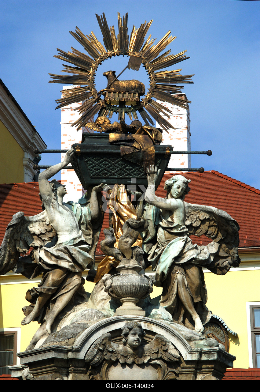 Győr, Frigyláda-szobor a Gutenberg téren. A Frigyláda-szobrot III. Károly király emeltette 1731-ben. A 8 méter magas szoborcsoport volutás lámpatartókkal megtámasztott, négyszögű talapzatán a Kálvária jelenete látható domborműben. Fent két lebegő angyal fogja közre és tartja a frigyládát.