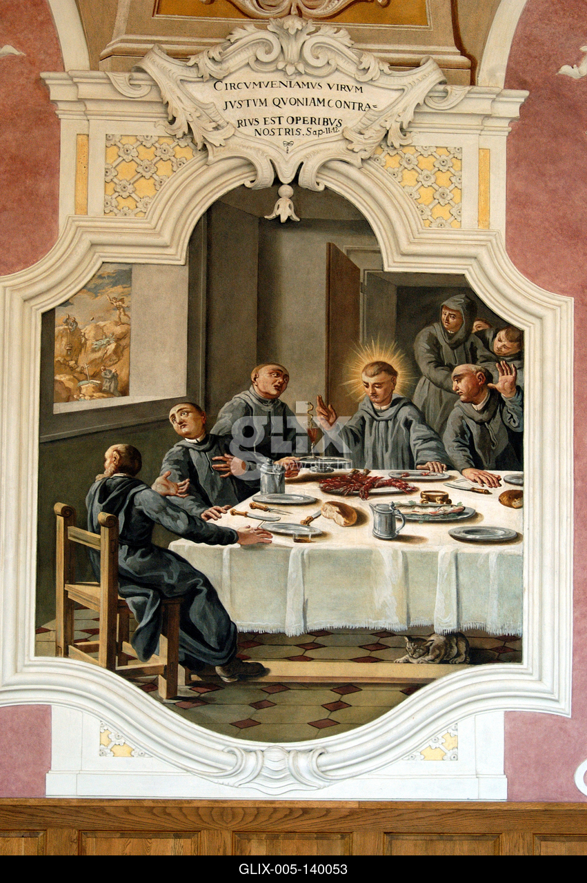 A Pannonhalmi Bencés Főapátság ebédlőterme, a refectoruim. A monostori ebédlőterem (refectorium) hajdani bejáratát emléktábla őrzi. Eredetileg a kerengőből nyílott és a déli szárnyat foglalta el. A monostor keleti szárnyában a XVII. században Sajghó Benedek emeltetett új ebédlőtermet. A belső tér szigorú szimmetriáját Davide Antonio Fossati svájci születésű velencei festőmester munkája is emeli.