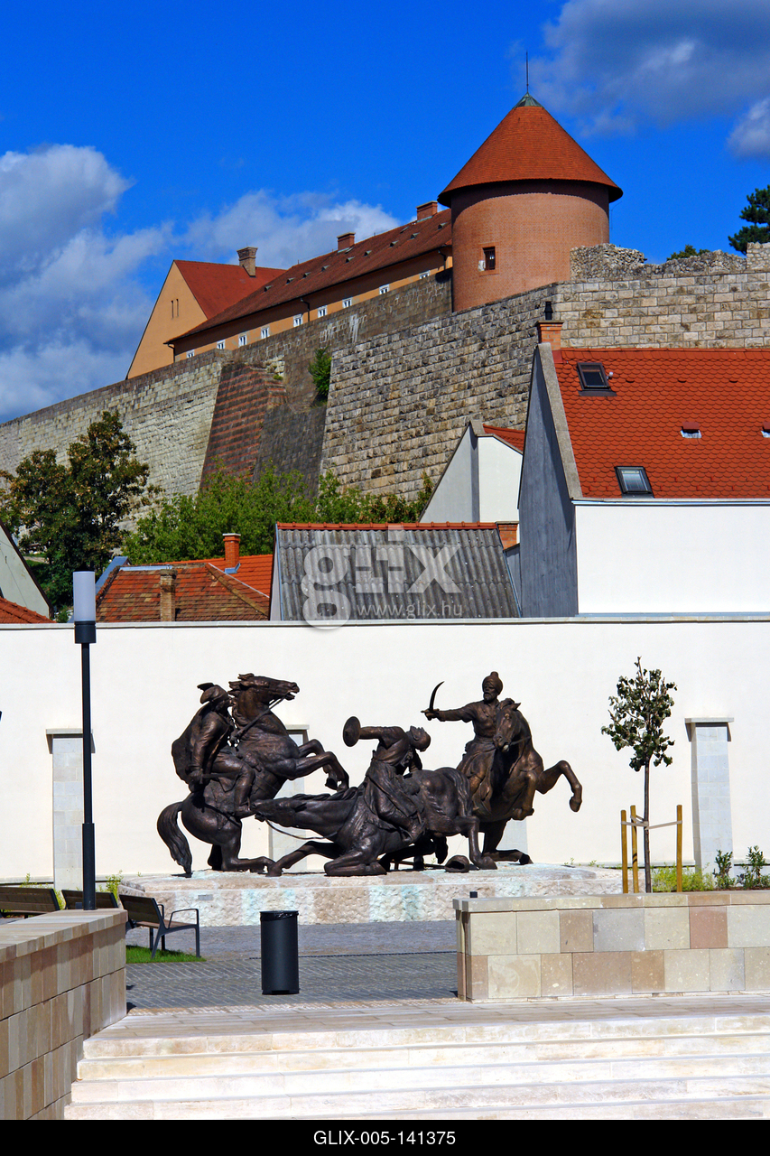 Kisfaludi Strobl Zsigmond Végvári vitézek című szoborcsoportja Eger belvárosában, a Végvári vitézek terén, háttérben az Egri vár.