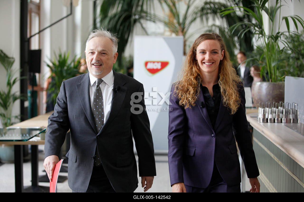 Hernádi Zsolt Mol vezérigazgató és Hosszú Katinka közös sajtótájékoztatót tart az együttműködési megállapodásukról a várkert bazárban. A háromszoros olimpiai bajnok is csatlakozott a Mol Csapatához, melynek értelmében ezentúl a Mol-csoport támogatja a világ egyik legjobb sportolóját. Hosszú Katinka (Pécs, 1989. május 3. –) háromszoros olimpiai, hétszeres világ- és tizenháromszoros Európa-bajnok magyar úszónő. Az első olyan versenyző, aki egy időben tartotta a világcsúcsot mind az öt vegyesúszó számban (200 m, 400 m, rövid pályán: 100 m, 200 m, 400 m).2017. január 12-én sorozatban negyedszer, összességében ötödször választották Magyarországon az év női sportolójának, majd átvehette az év európai sportolójának járó díjat is a Nemzetközi Sportújságíró-szövetség (AIPS) képviselőjétől is. Magyar sportoló ennek előtte legutóbb 1992-ben érdemelte ki ezt a díjat Egerszegi Krisztina révén. A riói olimpián élete legnagyobb sikerét érte el. 3 arany- és 1 ezüstéremmel az olimpia legeredményesebb úszója volt egyéni számokban. A Budapesten megrendezett 2017-es úszó-világbajnokságon július 24-én 200 vegyesen lett világbajnok, majd július 30-án végig vezetve a távon, a 400 méteres vegyesúszást világbajnoki csúccsal nyerte meg.