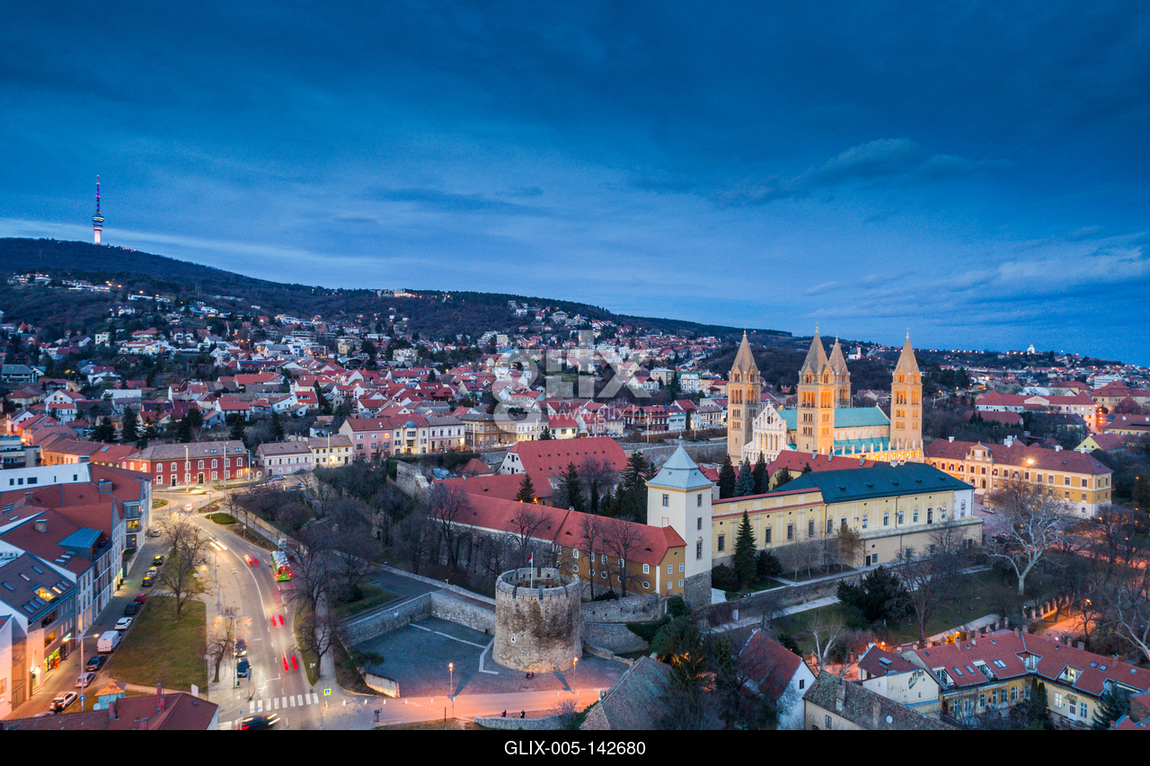 Pecs, Szekesegyhaz. Bird eye view at nightPécs belvárosa a Pécsi Székesegyházzal, alkonyati díszkivilágításban. Máttérben a Mecsek csúcsai, a Misina-tető a TV toronnyal és a Zengő.A pécsi Szent Péter- és Szent Pál-székesegyház (pécsi dóm, bazilika vagy vártemplom) a Pécsi egyházmegye katedrálisa, a város egyik jellegzetes épülete.