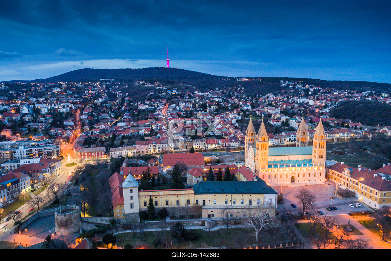 Pecs, Szekesegyhaz. Bird eye view at nightPécs belvárosa a Pécsi Székesegyházzal, alkonyati díszkivilágításban. Máttérben a Mecsek csúcsai, a Misina-tető a TV toronnyal.A pécsi Szent Péter- és Szent Pál-székesegyház (pécsi dóm, bazilika vagy vártemplom) a Pécsi egyházmegye katedrálisa, a város egyik jellegzetes épülete.