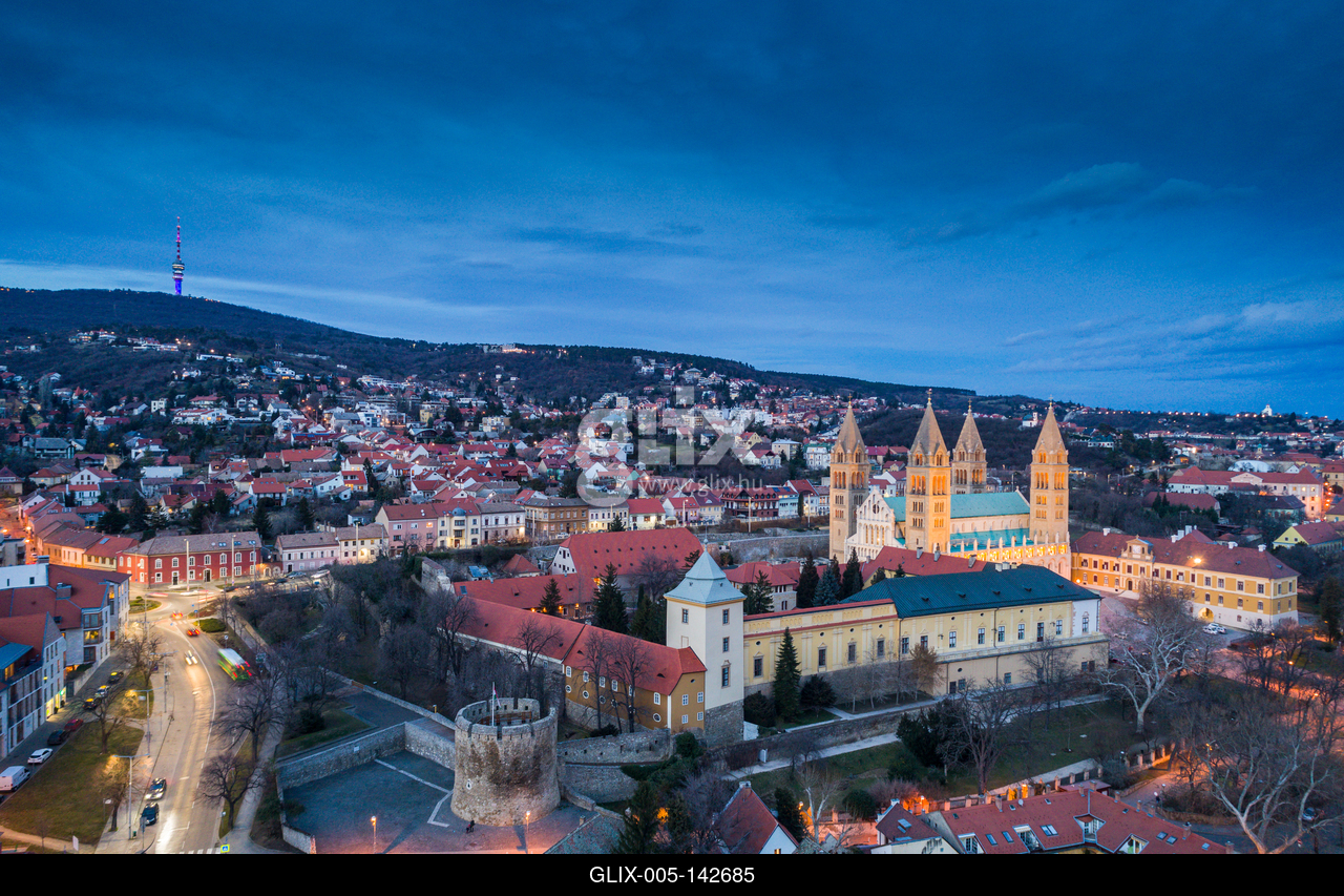 Pecs, Szekesegyhaz. Bird eye view at nightPécs belvárosa a Pécsi Székesegyházzal, alkonyati díszkivilágításban. Máttérben a Mecsek csúcsai, a Misina-tető a TV toronnyal.A pécsi Szent Péter- és Szent Pál-székesegyház (pécsi dóm, bazilika vagy vártemplom) a Pécsi egyházmegye katedrálisa, a város egyik jellegzetes épülete.